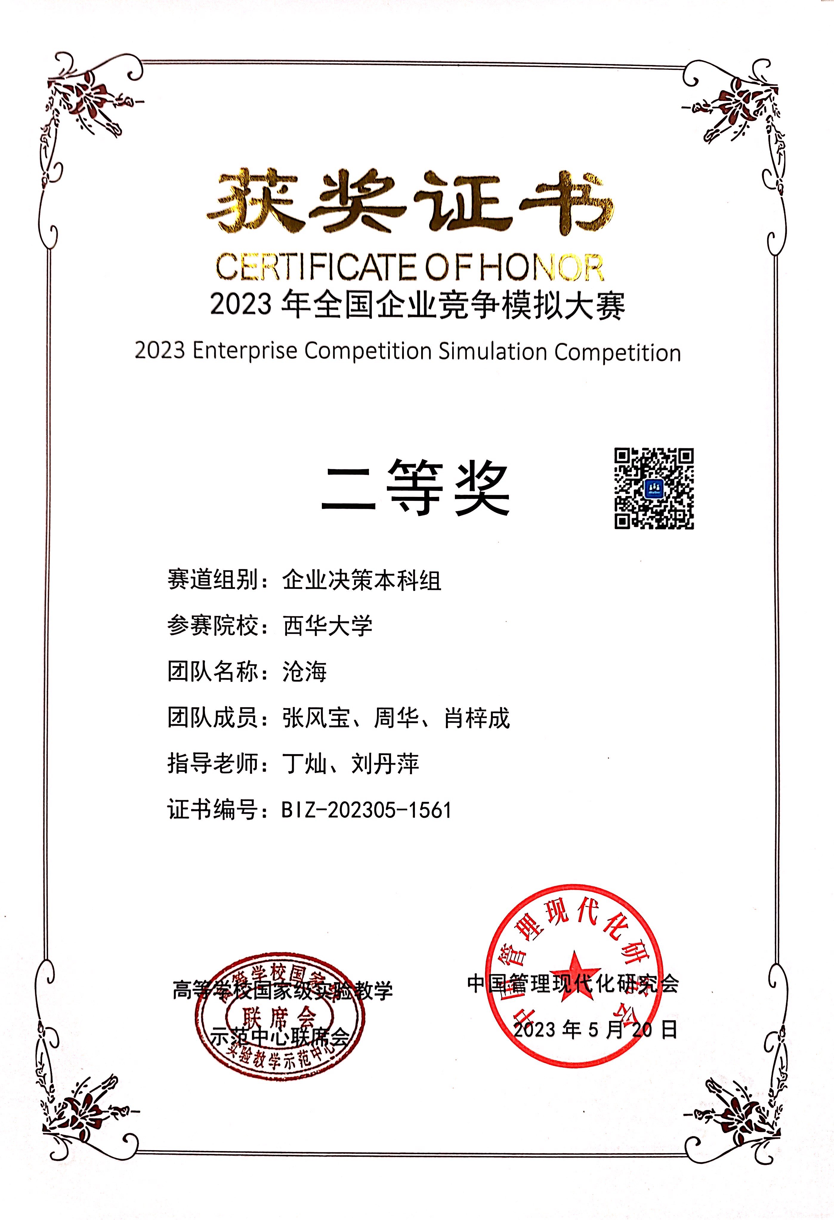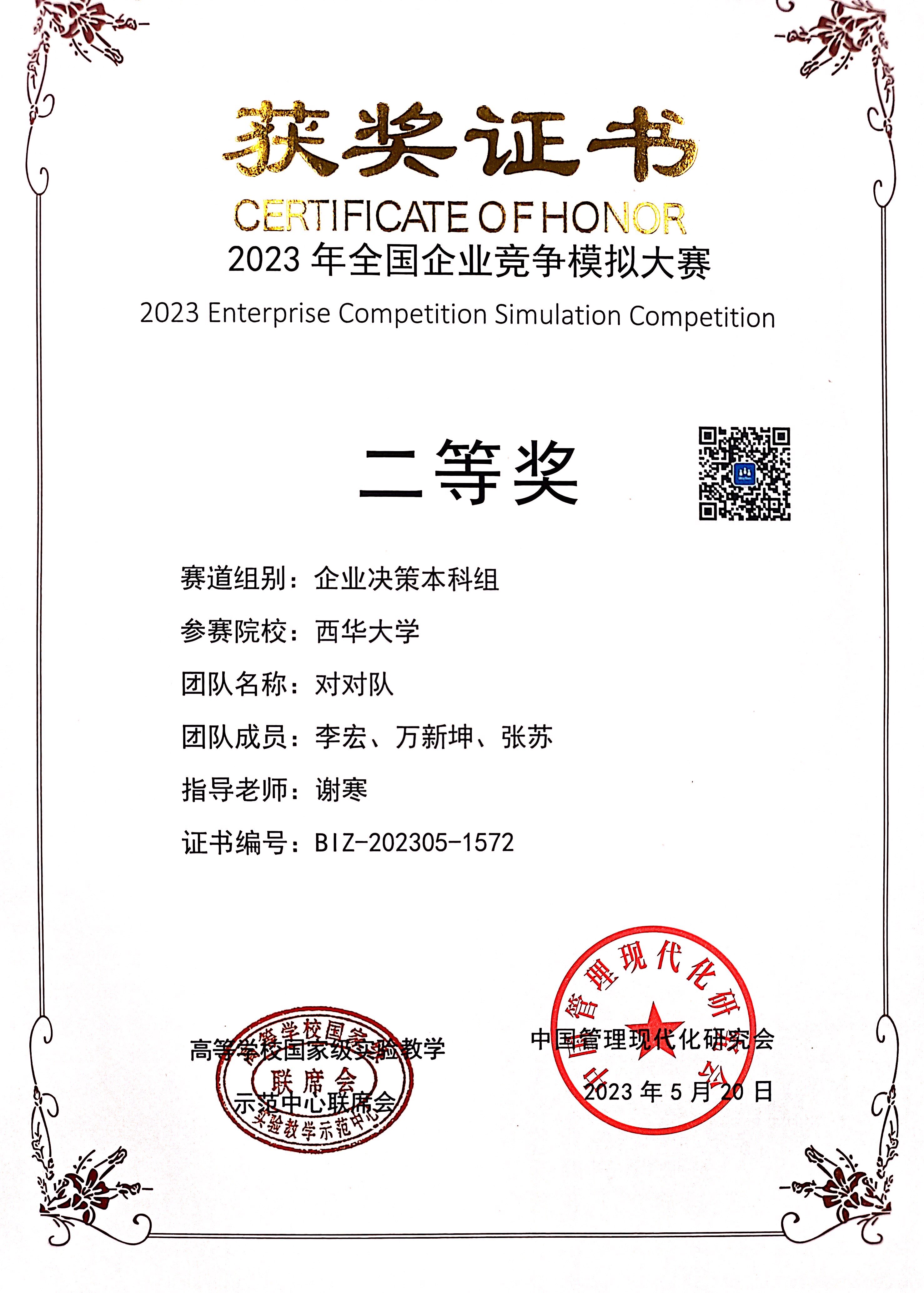 经过激烈的比赛,在5月23日公布的获奖名单中,我院学子黎冬梅、冉茂欢、张旭、唐雅灵、杨莉、舒畅、张风宝、周华、肖梓成、李宏、万新坤、张苏在指导老师谢寒、陈怡我、刘丹萍和丁灿指导下喜获全国二等奖两项,三等奖两项,获奖公示比赛网站链接http://www.ibizsim.cn/main/news/259。