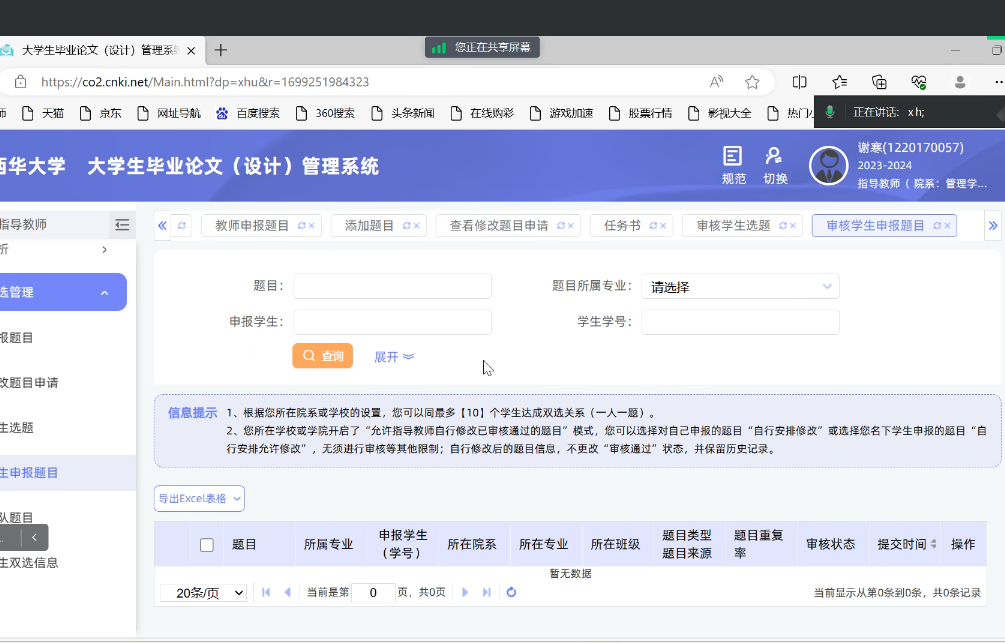 本科毕业论文是学生本科学习四年的总结,对于毕业生来说非常重要,同时,对于指导老师来说提高指导能力,规范指导过程也非常重要。为进一步提升管理工程系本科毕业论文质量,11月6日,我系以腾讯会议和3E403会议室线下同步线上线下相结合方式开展的方式,进行本科毕业论文指导的相关工作教学研讨会。会议由管理工程系副主任谢寒主持,学院党委副书记谢君出席会议并做重要讲话,管理工程系全体教师参加会议。