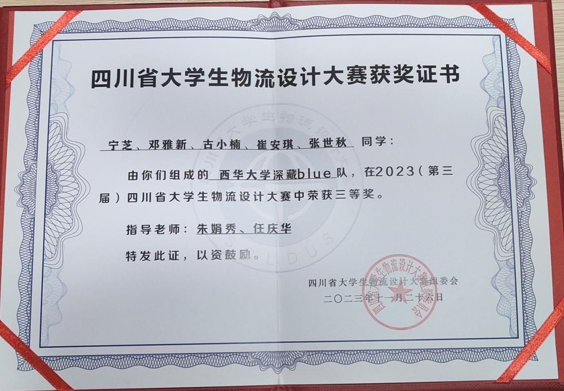 近日,在刚刚落下帷幕的四川省大学生物流设计大赛的总决赛中,我院学子宁芝、邓雅新、古小楠、崔安琪、张世秋组成的深藏blue队成功在指导教师朱娟秀、任庆华的指导下喜获省级三等奖,朱娟秀、任庆华两位指导老师也获得了“优秀指导老师”称号。
