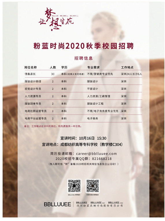 4、将获得:①面试综合评估同等条件下优先录用。②2020应届毕业生校招终试直通车/校园实习生直通车。直面粉蓝时尚高层近距离交流职业规划。现金红包奖励500+精美礼品。