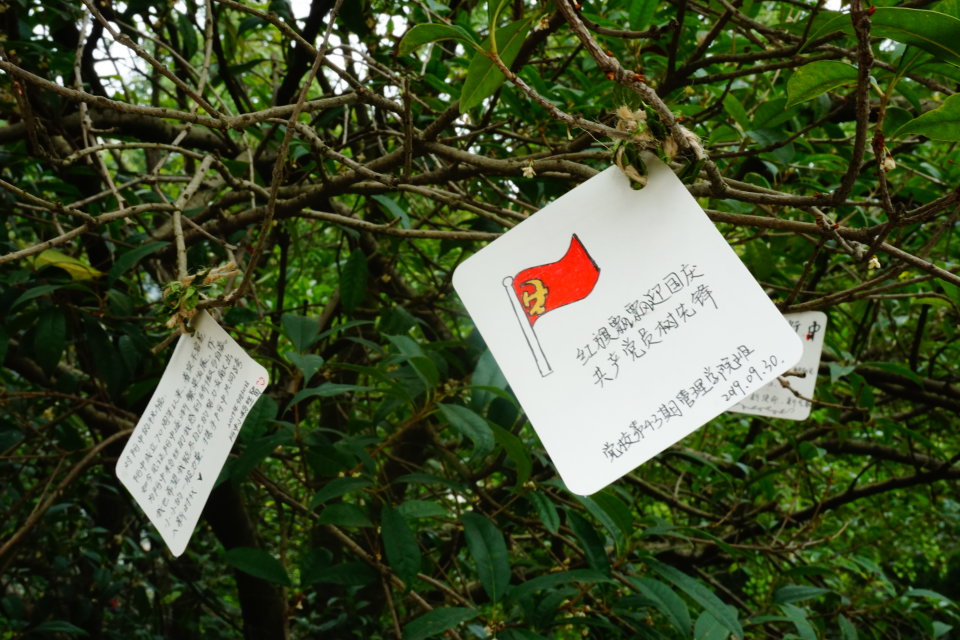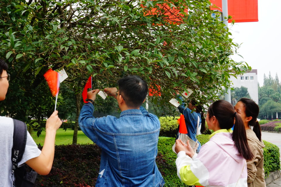 活动开展前期,各组组长带领组员收集从建国至建国70年期间的重大事件,包含从中国“站起来”(新民主主义革命、社会主义革命、社会主义初步建设),“富起来”(邓小平理论、“三个代表”重要思想、科学发展观)再到“强起来”(习近平新时代中国特色社会主义思想)三大系列。活动从学员设计纪念卡片环节开始,将收集的资料进行整理,书写在纸片上同时也记录下对新中国70周年华诞的祝福。接着学员进行分组讨论,并派代表上台分享。在活动的最后,组长带领大家前往各大教学楼将学员们设计的纪念牌挂置树上和共享单车上,让更多同学朋友看到建国历史的点滴。