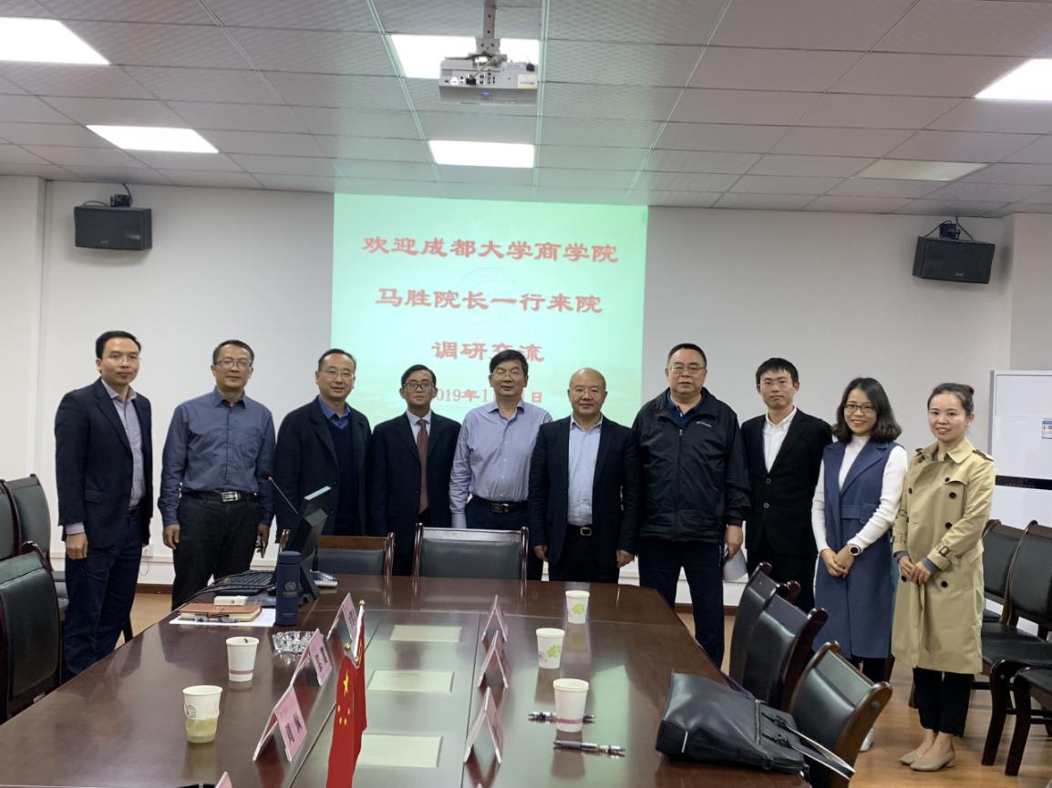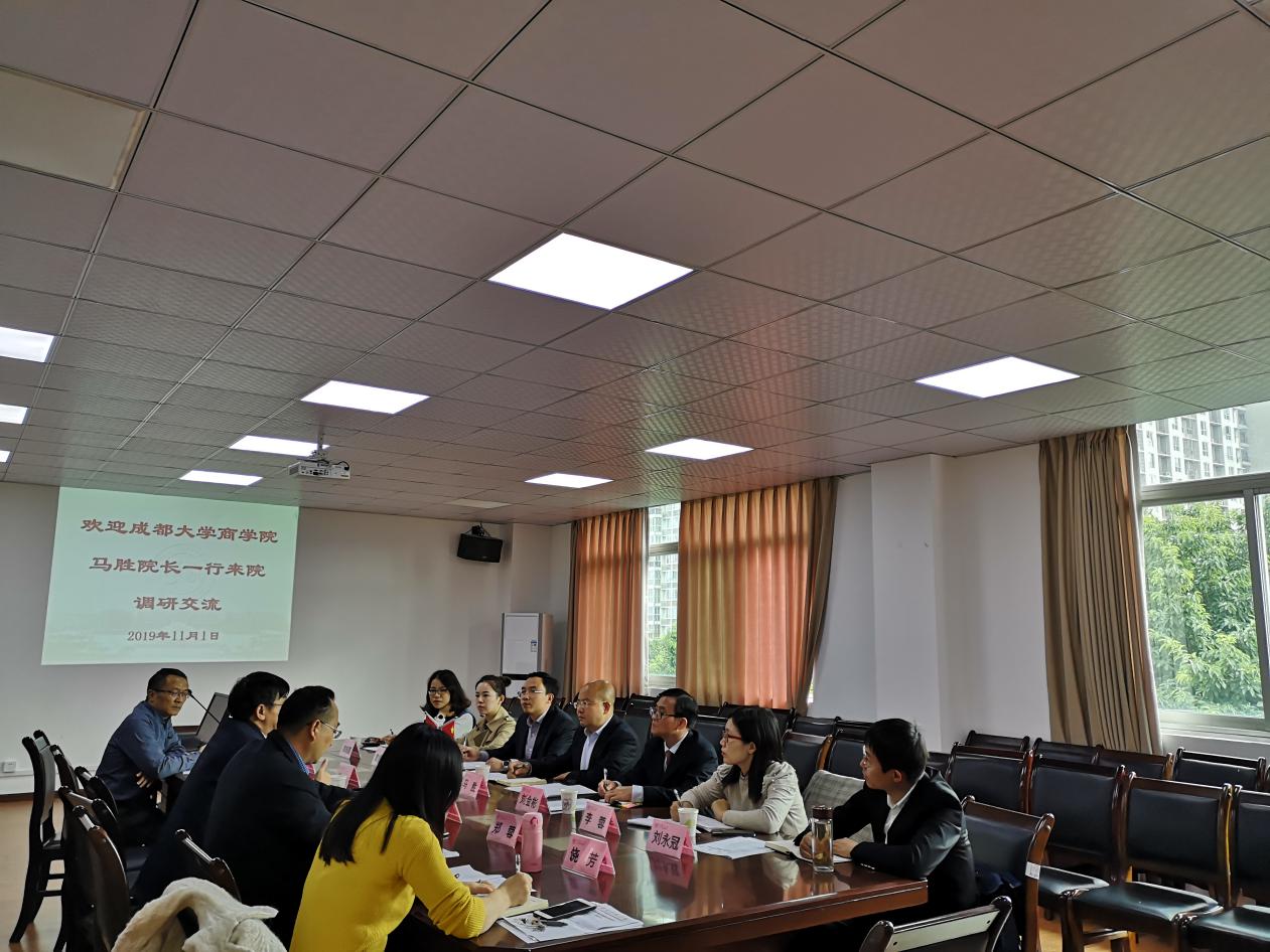11月1日下午,成都大学商学院院长马胜、副院长刘金彬一行7人来我院调研交流。学院院长谢合明,副院长周佩、牟绍波,院长助理黎霞、党政办主任饶芳以及ACCA项目中心主任余鹏举参加座谈。座谈会由谢合明院长主持。