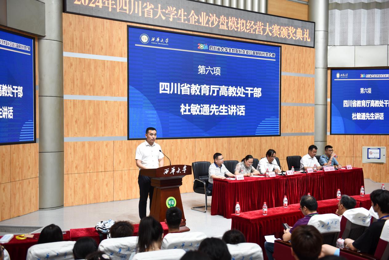 随后,四川省教育厅高教处干部杜敏通先生讲话。杜敏通指出,本次大赛由四川省教育厅主办,以“赛学融合,立足培养,鼓励创新,追求卓越”为指导思想,全面贯彻全国教育大会精神,围绕教育强国和创新驱动战略,让学生认知数字化企业经营决策的前沿趋势,深入理解企业数字化转型的方法论和价值,锻炼学生在数字经济背景下的企业创新能力、经营能力、管理能力和协作能力,培养学生综合实践能力和创新思维。