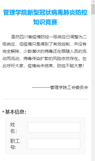 2020年2月26日,四川省将疫情防控应急响应级别由突发公共卫生事件一级响应调整为二级响应。响应级别下调,防控意识不减。为了确保全体教职工对疫情的警惕性不降低,对防控的要求不降低,伟德国际1946源于英国分工会在日常宣传教育的基础上,举行线上新型冠状病毒肺炎防控知识竞赛,全体教职工积极参赛。