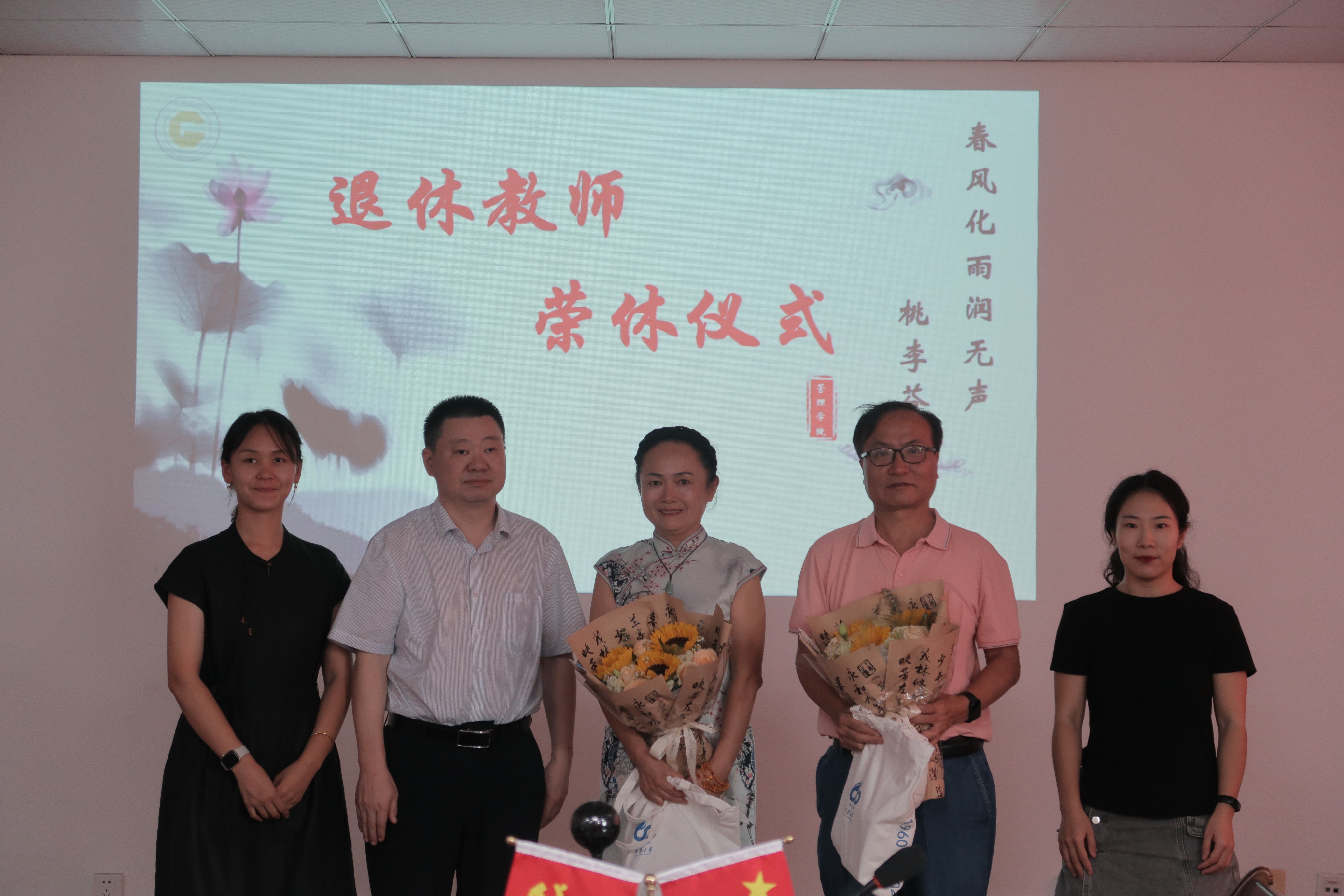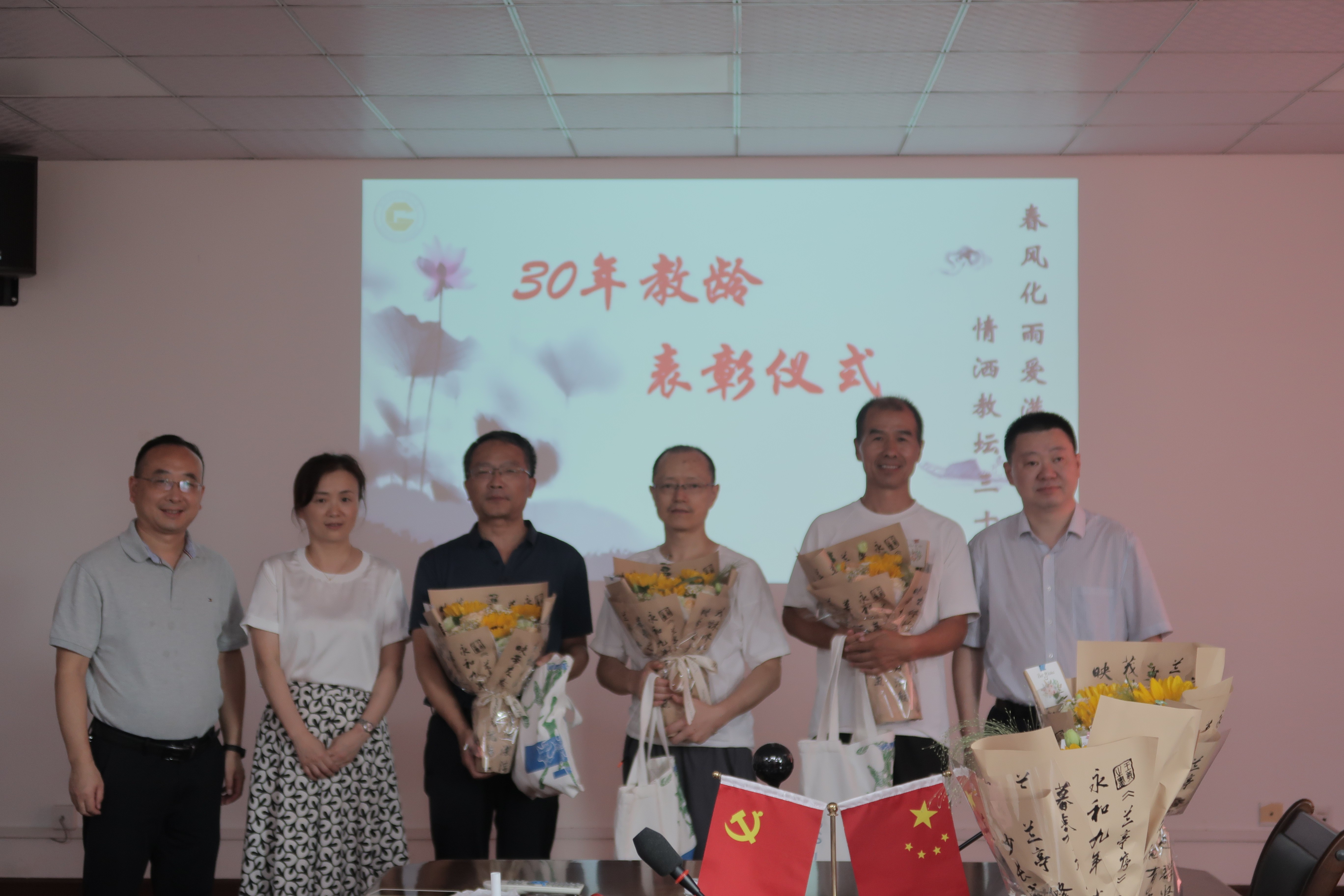 接下来进行了30年教龄表彰仪式,新教师为这些资深教师献花,学院领导班子为教师们颁发了纪念品。牟行军、王永昌等教师分享了他们的教学感悟,表达了对立德树人使命的体悟以及时代对教育提出的新要求。