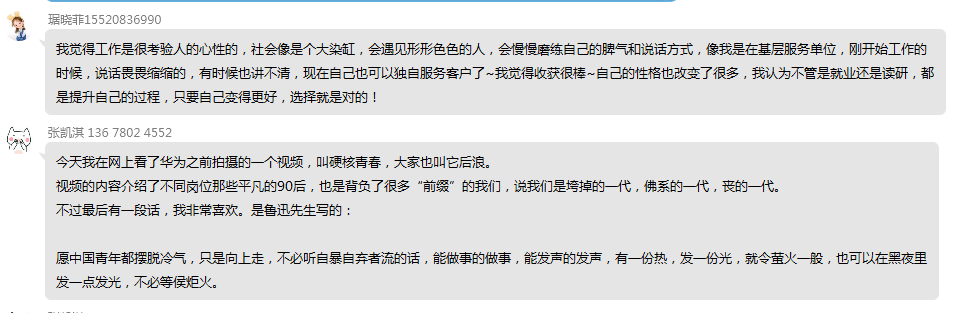主持人开场后,全体成员进行了签到。首先,大家观看了在学习强国上的三个有关就业措施的视频:《高校毕业生:这些就业措施你知道多少?》、《广东:八大举措促广东高校毕业生就业创业》和《安徽:线上线下相结合 促进高校毕业生“稳就业”》。无论是人社部门还是各大学校,都在积极的解决今年应届生的就业问题。紧接着,同志们共同阅读了《高校毕业生,这些举措助你就业》、《四川四项举措保就业》和《促大学生平稳就业,四川多所高校出台保障措施》三篇文章,了解了四川对应届毕业生就业的关切。看完这些视频和文章后,已经就业的同志也分享了自己就业的感受和在工作中的所学所感,没有就业的同志也感受到国家和政府对我们的关注。