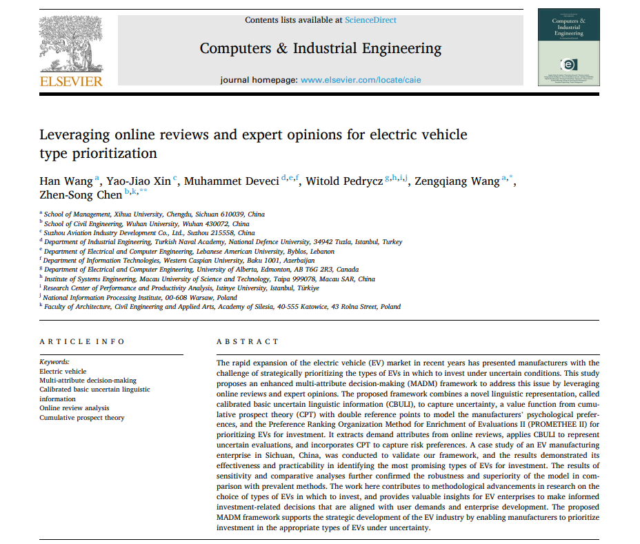 近日,伟德国际1946源于英国非全日制研究生王涵在工程技术领域顶级期刊《Computers & Industrial Engineering》(中科院一区TOP期刊,影响因子6.7)上成功发表题为“Leveraging online reviews and expert opinions for electric vehicle type prioritization”的学术论文。该论文以伟德国际1946源于英国为第一单位,王涵为第一作者,其指导教师王增强教授为通信作者。