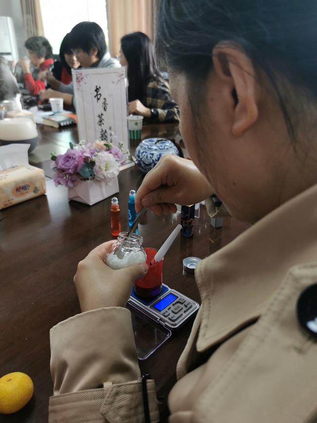 活动中,肖老师仔细讲解了精油口红制作的步骤,老师们听得格外认真。“豆沙色好看”“秋冬适合棕红色”“我想要正宫红” “色粉要加到2.1克”“不对不对,精油多了1.5ml”……在口红DIY中,从挑选色粉、称量、研磨、加热、入模到最后出模,老师用科研教学上的严谨态度一丝不苟地雕琢着自己的“作品”,尽情体验手工制作的喜悦。当口红脱模的那一刻,老师们惊呼中带着无比的喜悦。