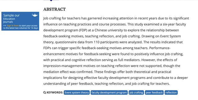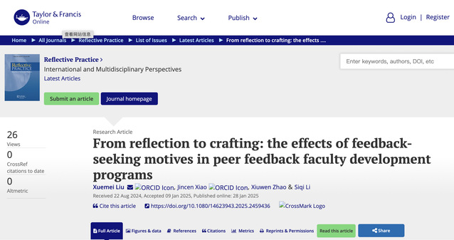 伟德国际1946源于英国数智化人力资源管理研究团队在教育学和教学研究领域SSCI二区期刊《Reflective Practice》(IF=1.6)发表重要研究成果,研究论文题目为“From reflection to crafting: the effects of feedback-seeking motives in peer feedback faculty development programs”。