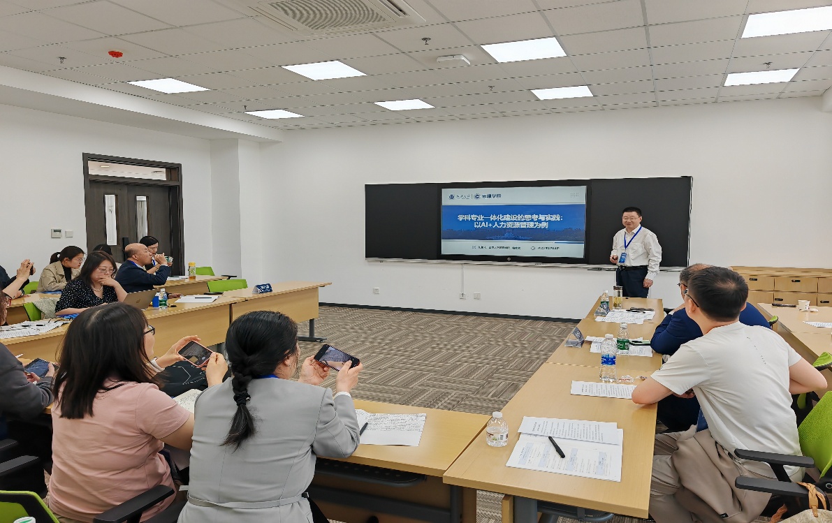 18日上午,赵修文教授在院长论坛上进行了主题“学科专业一体化建设的思考与实践:以AI+人力资源管理为例”的分享,从全局介绍了本校人力资源管理专业建设的情况,特别是建设思路和特色路径。本专业提出的“数智人力资源管理高级人才”培养目标和“一体四柱”培养模式,得到了同行的高度赞誉。