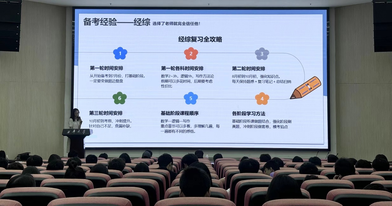 资产评估专业罗溶珊则分享了备考经综心得,提醒学弟学妹们需提前规划考研时间,熟悉专业课大纲题型,做好专项训练,同时通过合理安排备考时间查漏补缺。
