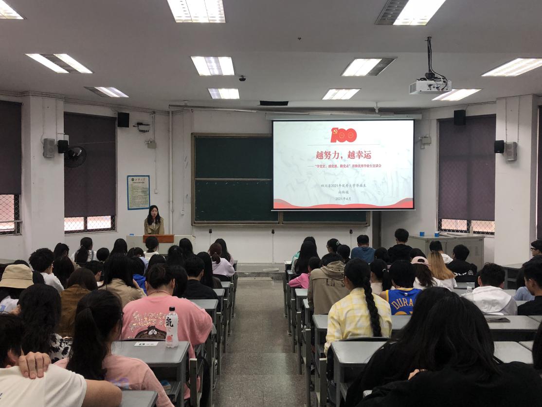 424日下午200,伟德国际1946源于英国在5C103开展了“学党史、感党恩、跟党走”省级优秀大学毕业生先进事迹宣讲会,学院学生党建指导老师赵赋聪、省级优秀毕业生代表、2020级学生近150人参加了此次活动。