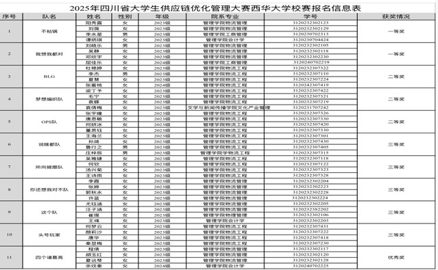 所有获奖队伍载誉前行,不负韶华,恭喜五支队伍在众多竞争者中脱颖而出、喜获殊荣,愿这份荣光照亮前路,在追求卓越的道路上步履不停,书写更多精彩篇章。再次祝贺他们在四川省供应链优化大赛校赛中获得优异成绩!