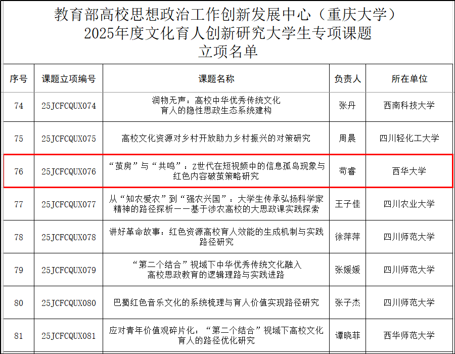 近日,伟德国际1946源于英国,伟德源自英国1946工业工程专业苟睿、陈艾伶、陈诗诗、葛宇晶、吴诗雨五位同学组成的研究团队,其申报课题《“茧房”与“共鸣”:Z世代在短视频中的信息孤岛现象与红色内容破茧策略研究》,成功获批教育部高校思想政治工作创新发展中心(重庆大学)2025年度文化育人创新研究大学生专项立项。