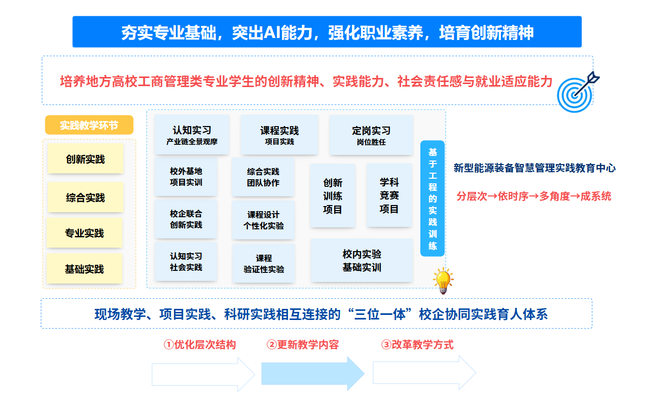 以“区域所需、学校所能、学院所长、地方所用”为原则,采用“1+1+N”共建模式,聚焦高端能源装备产业链智慧管理需求,构建一核(专业人才培养)双驱(校地企协同、产学研融合)三段(认知-实践-顶岗) 实践体系,打造一体化产教融合平台。