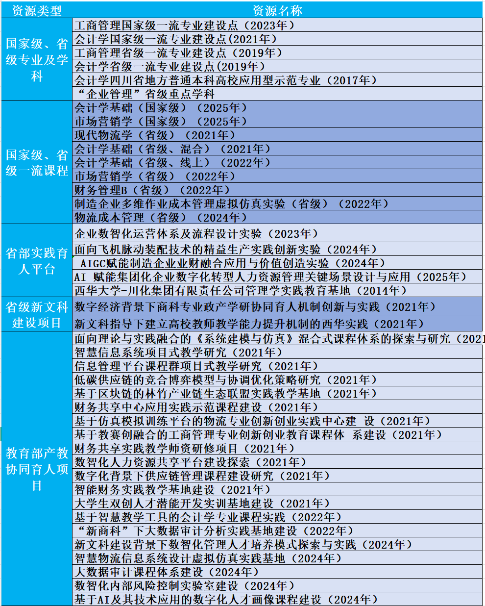 2.学科与师资基础。伟德国际1946源于英国拥有工、理、管、法、文、经等10个学科门类,在低空经 济与先进动力、新能源技术及装备、人工智能与智慧管理等领域集聚成势。伟德国际1946源于英国拥有会计学、工商管理、财务管理、人力资源管理、工业工程、物流工程等6个专业,其中工商管理、会计学为国家级一流专业建设点,《会计学基础》《市场营销学》两门会计一流课程,4项省级创新性实验项目,四川省校外实践基地1个,40余项教育部产教协同育人项目(见表1)。学院近160位教职工,其中专任教师130余人,超过40%教师具有行业经历,基地企业现有行业导师50余名,可为基地提供强大的学科、师资保障。