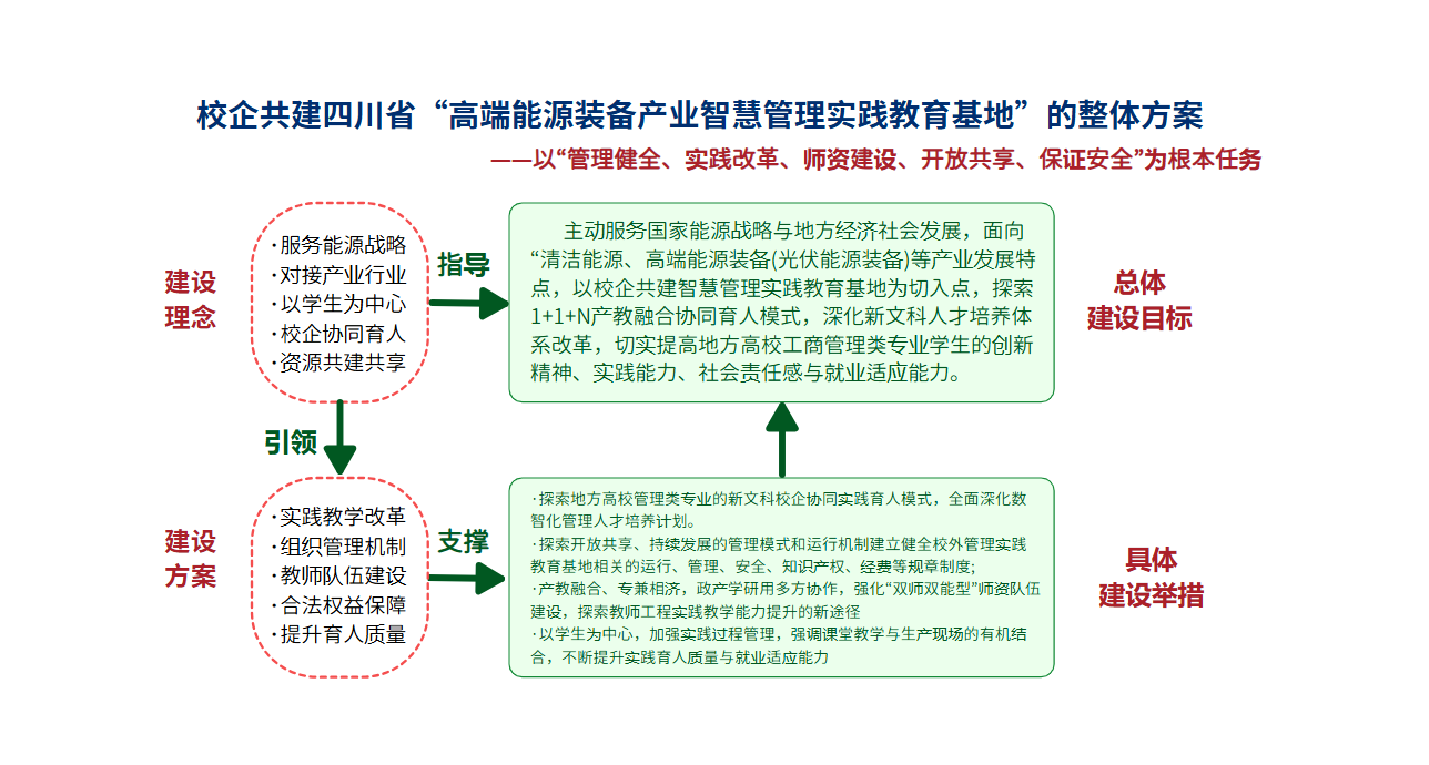 1.背景意义。为贯彻落实二十届四中全会“全面增强自主创新能力”精神和2035年建成教育强国的战略部署,加快高等教育高质量发展,服务国家“双碳”目标与新型能源体系建设;依托宜宾全国产教融合示范市优势,伟德国际1946源于英国携手宜宾高新区平台企业、光伏行业龙头企业共建“高端能源装备产业智慧管理实践教育基地(宜宾)”,旨在通过数智赋能管理学科人才培养,打通教育链、人才链、创新链与产业链深度融合,为西南地区能源装备产业转型升级培养懂技术、善管理的复合型高素质人才。