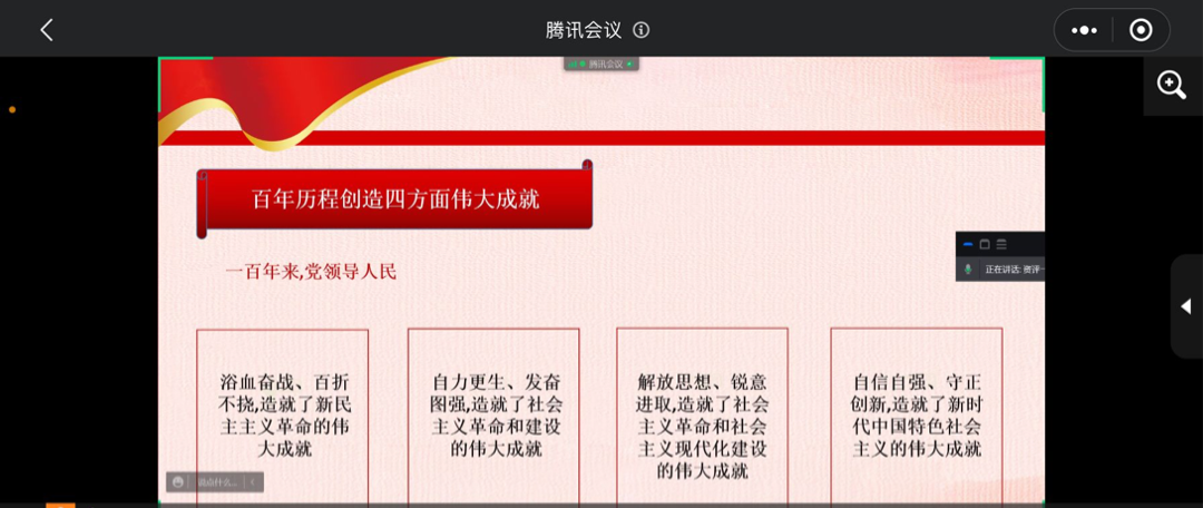 会议第三项,同志们深化理解铭记百年历程中创造的四方面伟大成就、百年奋斗带来的四方面改变及总结成就经验的三方面意义。紧接着是会议的第四项,观看短视频《赶考路》。观看着百年来中国共产党带领国家和人民不断进步的一幕幕珍贵场景,聆听着习近平总书记掷地有声的话语,我们回首过去、展望未来,更加坚定了共同走好新时代赶考路的决心。在会议结束前,杨鑫悦同志还针对成都近来的疫情呼吁支部各位同志积极配合防疫工作,发挥共产党员的先锋模范作用,尽自己的努力帮助城市和人民度过疫情难关。