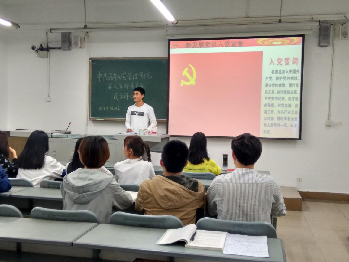 活动伊始,组织委员肖金萍为全体党员佩戴党徽并发放《党章》,并由会议主持人带领全体党员重温了入党誓词,在民主评议活动阶段,支部开展了党员自我评价、党员相互评议、对支部班子评议三部分活动。紧接着,支委带领全体党员学习了《党章》内容,以增强毕业班党员的党员意识。最后,学院学生党总支组织员禹晓榕对本次活动进行点评,他实事求是地指出支部活动中存在的不足,并提出改进意见。支部全体党员表示,今后将严格按照《党章》要求,争做一名思想上、行动上都合格的共产党员。