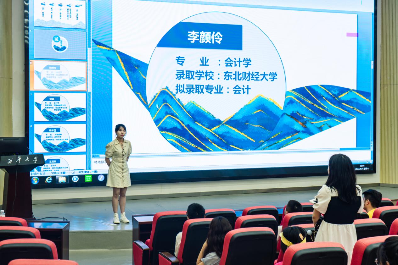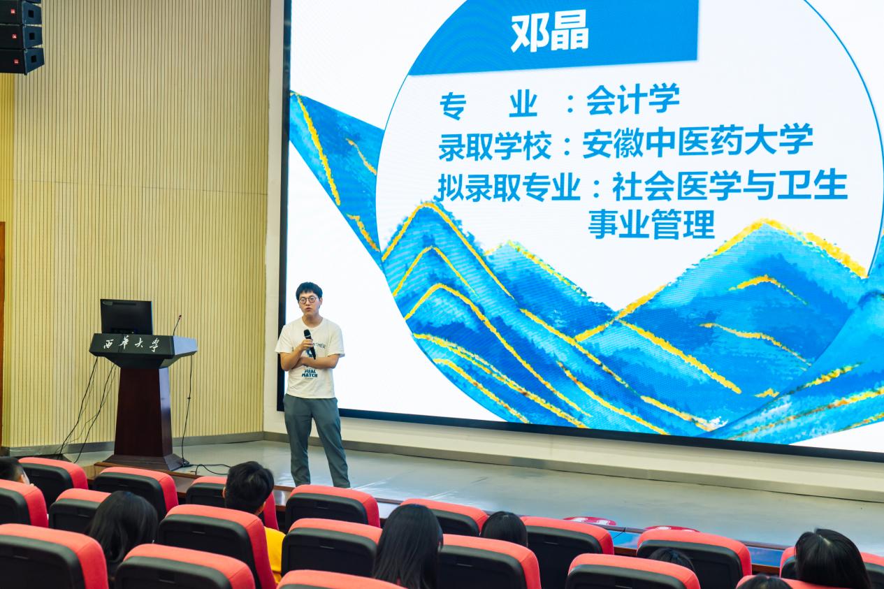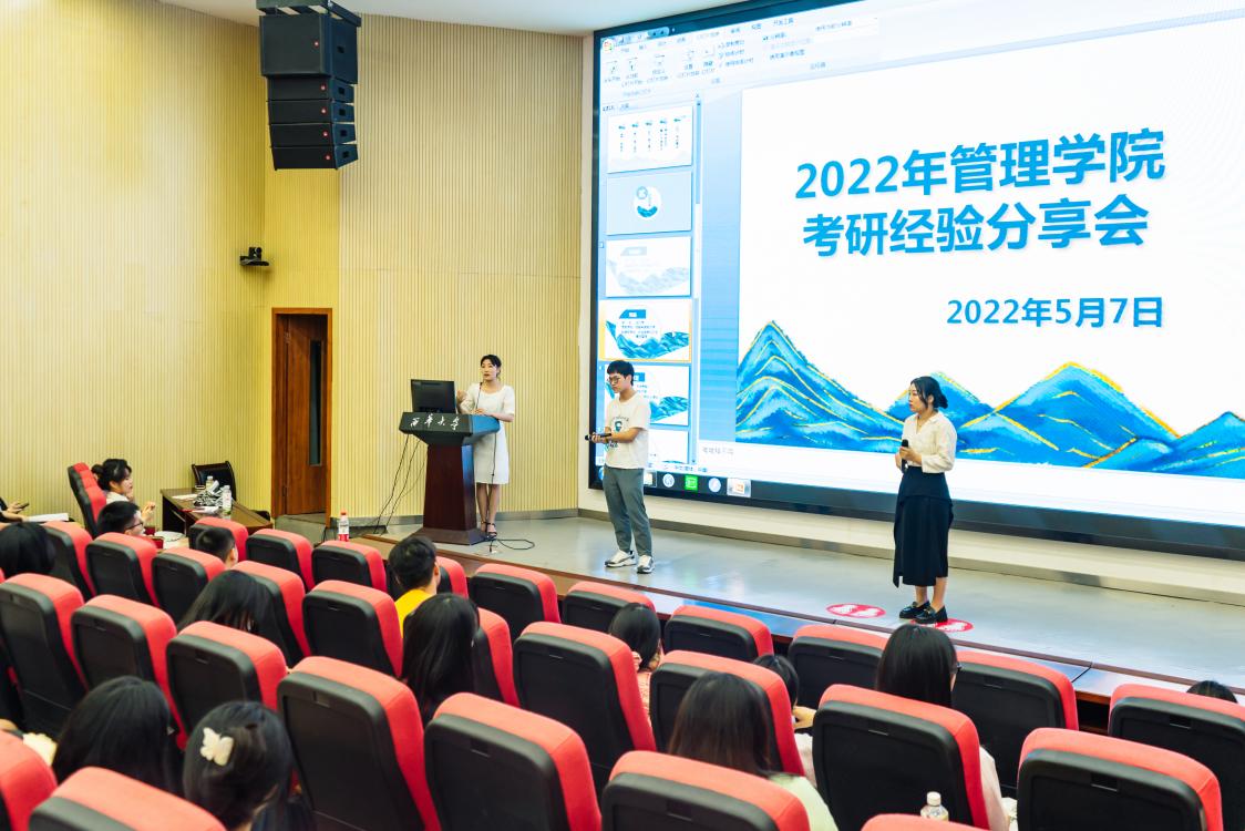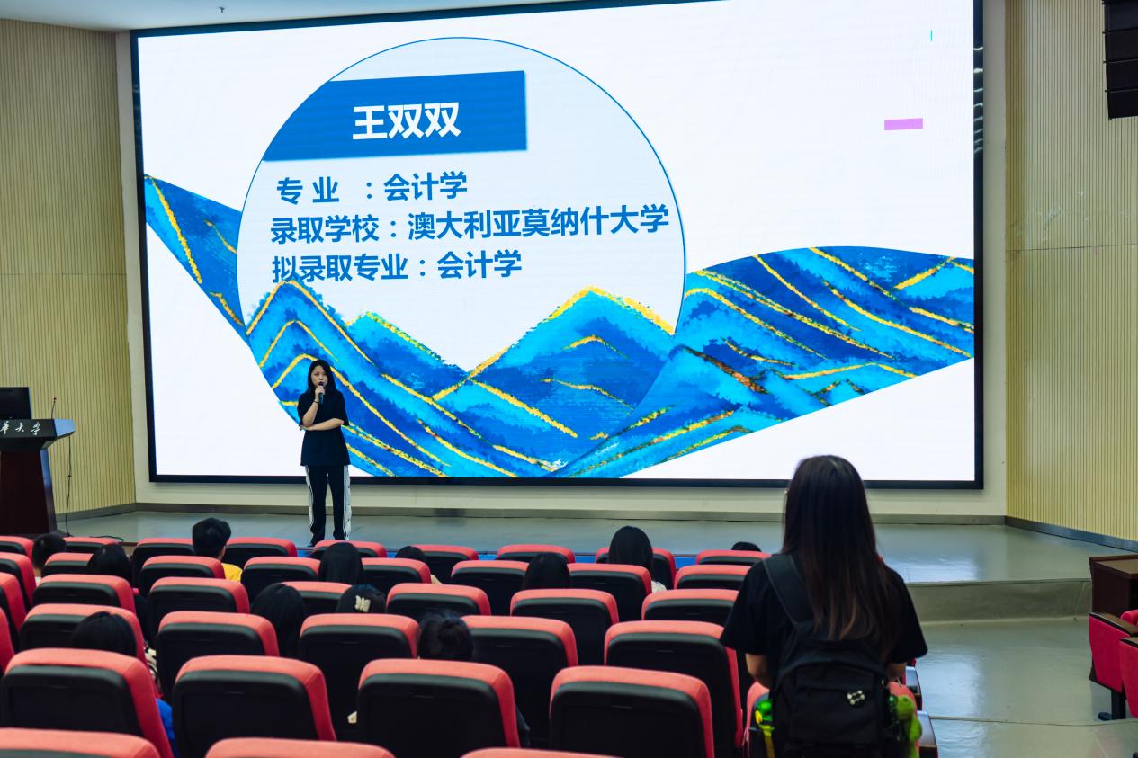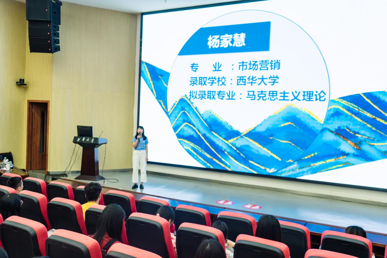 分享会上,邓晶同学就自身考研调剂经验为同学们讲解了如何选择考研学校及专业,强调了择校和调剂院校选择的重要性。李颜伶同学介绍了如何平衡考研和专业课程之间的关系,对专业课、政治、英语的复习规划进行了详细讲解,鼓励学弟学妹们认真备考四六级,并强调在备考期间同学们一定要放宽心态、坚持不懈,才能取得最后的胜利。杨家慧同学就备考的不同阶段分享了三个经验,一是跨专业考研应如何备考;二是如何制定考研复习规划;三是在备考冲刺阶段应如何进行强效记忆。王双双同学分享了如何申请留学、备考雅思和GRE的经验,重点强调了在备考期间保持积极心态和坚定目标的重要性,提醒学弟学妹们要经常做总结复盘,找到适合自己的学习方法。