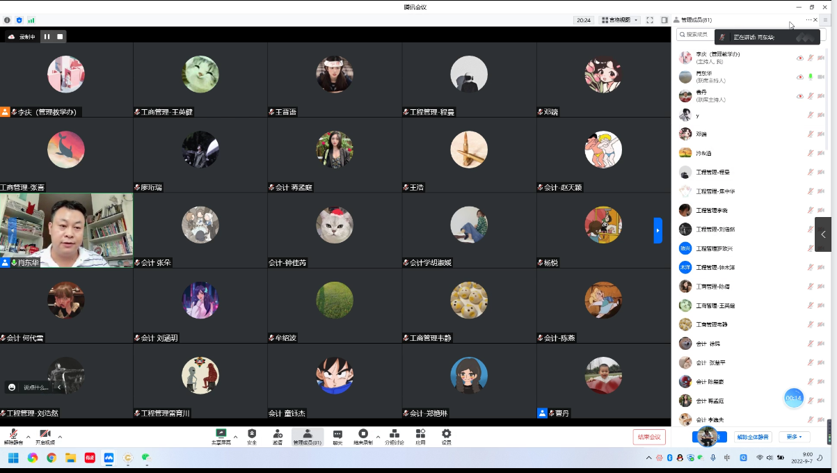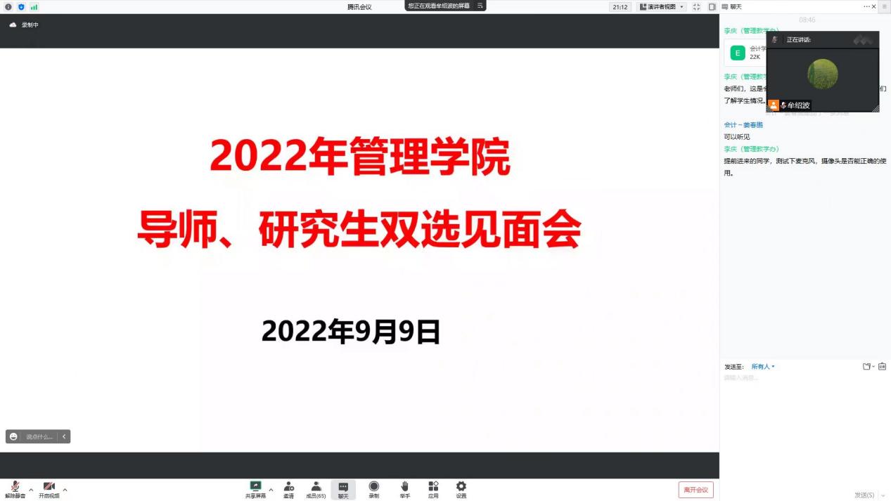 9月9日,学院组织会计、会计学、工商管理、工程管理等专业导师、研究生双选见面会。见面会由副院长牟绍波主持。会上,各位研究生导师从研究方向、从事研究生项目、科研成果、招生要求等方面进行了介绍。2022级研究生新生逐一从个人兴趣爱好、研究生生涯规划等方面展开介绍。随后,副院长牟绍波就双选规则、要求等方面进行讲解。