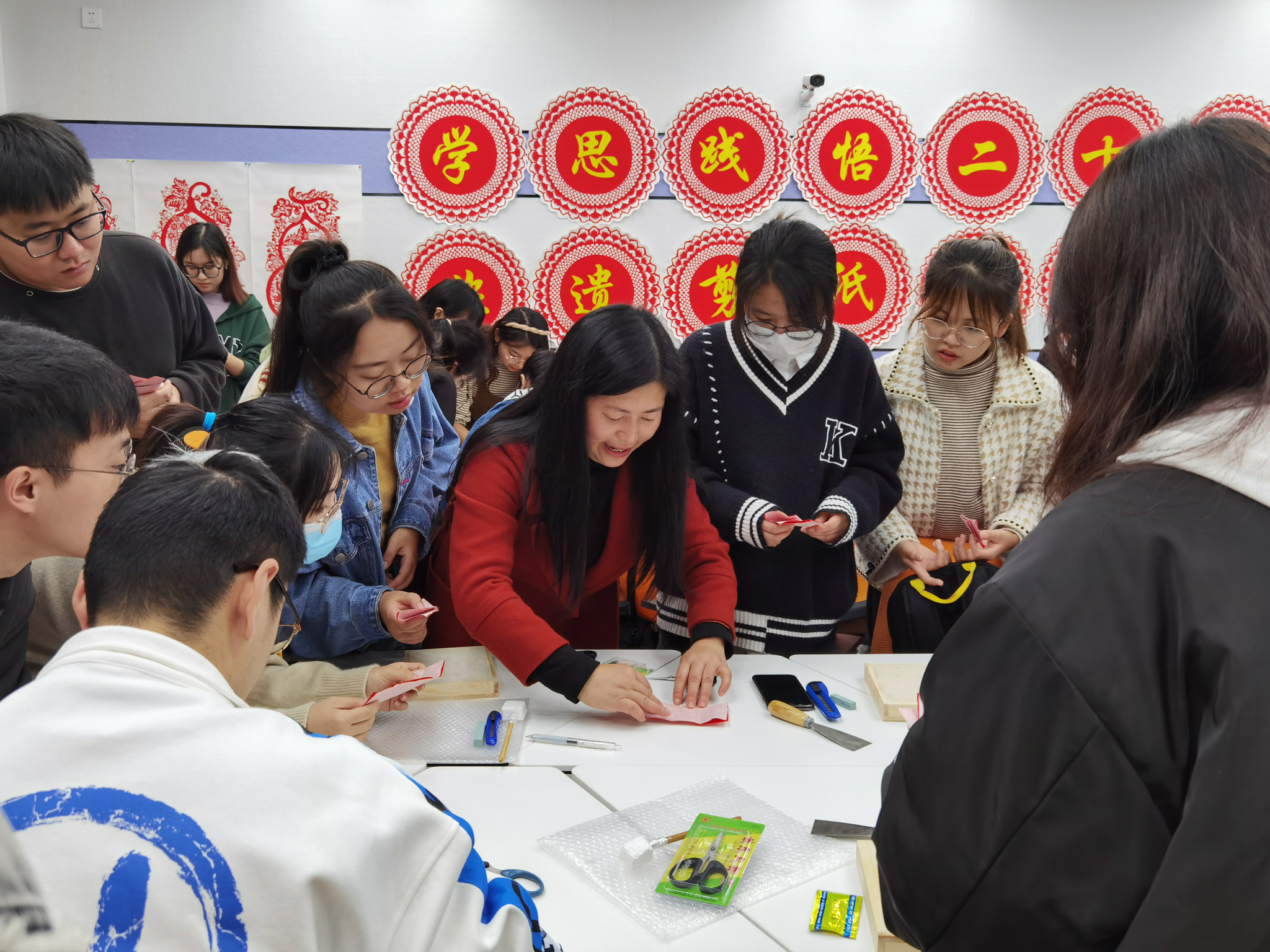 活动开始,主持人为学员们介绍此次剪纸授课老师汪孝君老师。在热烈的掌声中,汪老师为学员们展示了剪纸教程及个人作品,学员们对汪老师的剪纸技术表示赞叹,也对此次剪纸活动充满期待。汪老师为学员们简单讲解裁剪基础图案的方法后,提出希望学员们挑战自我,使用刻刀、剪刀、蜡盘等工具制作出更加精美的剪纸作品。随后,党校干部们为学员分发剪纸素材及工具包,学员们认真投入,在此过程中汪老师和李萌老师也不断为大家答疑解惑,经过不懈努力,剪纸作品顺利完成。一幅幅精美的作品不仅是对中国传统文化的传承,更传递了红色正能量,表达了学员们对党和祖国的热爱。活动结束后,全体成员合影留念,在学员们的欢声笑语中,本次活动圆满结束。