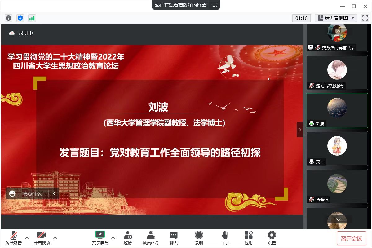 11月26日,我校教师刘波受邀请线上参加由四川大学生思想政治教育研究中心等主办的“学习贯彻党的二十大精神暨2022年四川省大学生思想政治教育论坛”,并作主题发言。