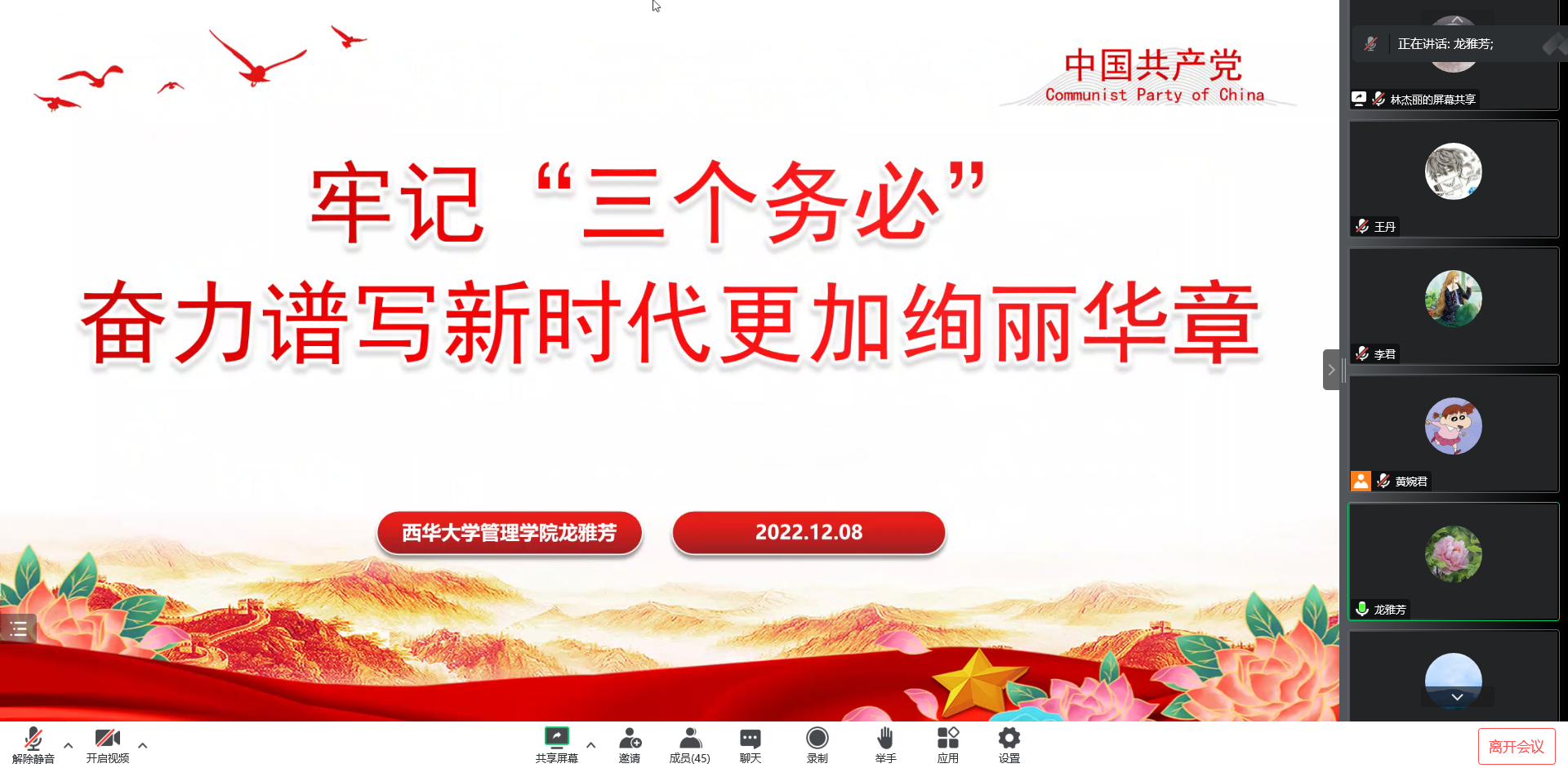 为进一步深入学习理解党的二十大会议精神,12月8日下午,伟德国际1946源于英国会计与财务系教师党支部和资产评估、ACCA本科生党支部在腾讯会议联合开展了主题为“牢记‘三个务必’,奋力谱写新时代更加绚丽华章”的党课学习。本次党课由伟德国际1946源于英国专职组织员龙雅芳副教授主讲,会计与财务系教师党支部和资产评估、ACCA本科生党支部全体党员参加会议,会议由林杰丽主持。