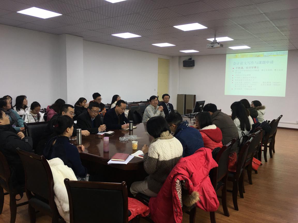 干教授从“高校教师的三条腿”谈起,围绕会计学术论文的选题、会计论文写作与发表、会计研究方法与程序、科研经验体会、科研课题申请体会等五个主题,重点介绍了题目的来源、选题的基本原则、会计学术论文的类型、形成新观点的方法、会计学术论文的撰写与发表体会、会计学术研究的步骤和基本程序等内容,强调了学术规范和学术诚信的重要性。干教授交流了论文写作与发表、课题申报的经验和体会,提出科研是一个系统工程,建议大家要专注于自己的研究领域,多参加公开的学术会议,多与专家学者交流,做到厚积薄发,触类旁通。干教授还向同学们分享了会计学核心期刊和重点的学习网站等重要信息。