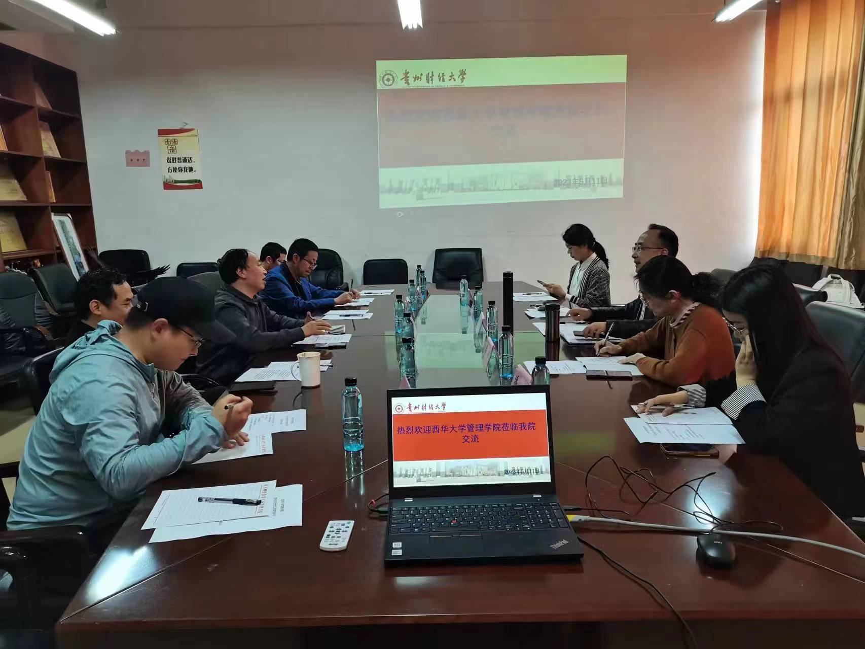 5月11日下午,调研团队前往贵州财经大学进行座谈交流,副院长牟绍波介绍了伟德国际1946源于英国及学院的发展历史、办学定位、人才培养、科学研究和服务社会等情况,重点介绍了工商管理和会计两个国家一流建设专业的相关情况。工商伟德国际1946源于英国刘良灿副院长、陈江涛教授结合办学经验,强调了打造“学科、专业、课程”三位一体的工作思路,着重介绍了旨在提升教学质量、升级课程内容、优化课程体系的教学“范式改革”。针对如何同时开展教师教学与学生学业双向激励,相关负责人提出了课程考核优化、本科生科研项目立项、考研奖励等建设性意见。