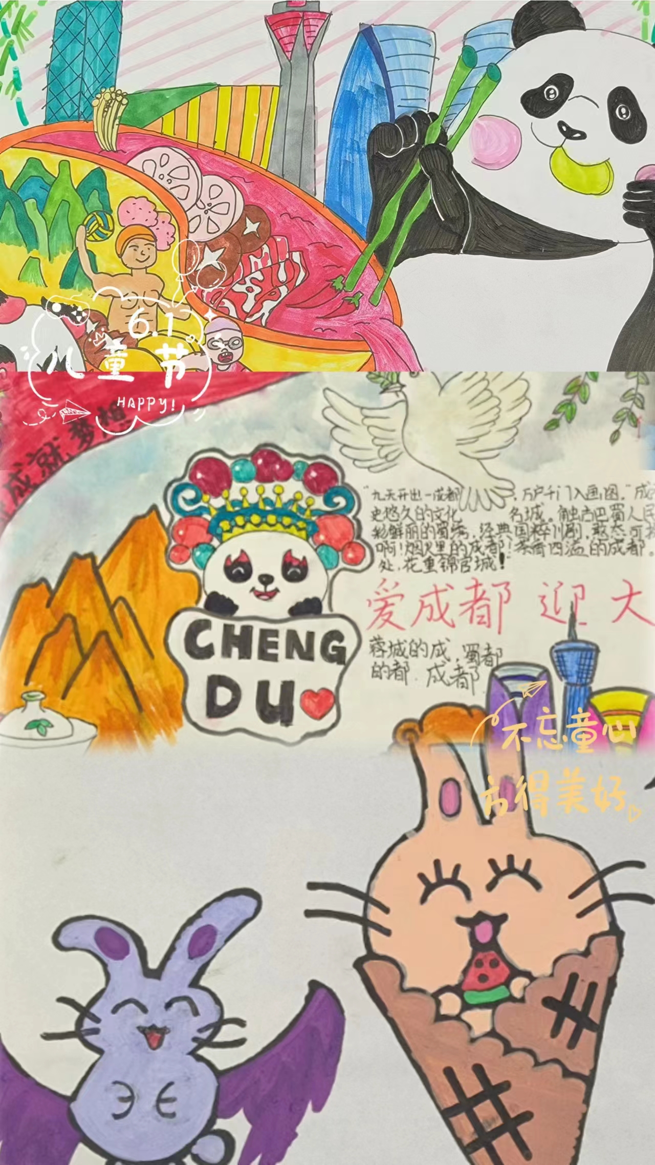 小朋友们在家长的协助下,围绕着“爱成都,迎大运”创作了一系列的书画作品,老师们一起交流分享、讲述着陪伴孩子们成长的点点滴滴。学院领导班子代表学院向小朋友们送上节日祝福,学院工会也为小朋友们准备了礼物,希望每个孩子都能在父母的陪伴下快乐健康地成长。活动在孩子和老师们的欢声笑语中落下帷幕,大家度过了一个充实而快乐的六一儿童节。